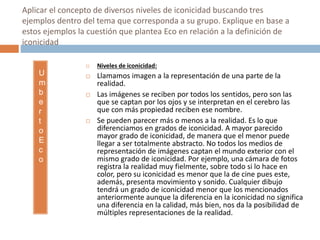 Eco plantea que existen diversos niveles de iconicidad en la representación de imágenes. Una fotografía en color tiene un alto grado de iconicidad al capturar fielmente la realidad, mientras que un dibujo tiene menos por no incluir movimiento y sonido. La diferencia en iconicidad no implica diferencia de calidad, sino posibilidad de múltiples representaciones. El signo icónico construye relaciones similares a las percepciones del objeto, no necesariamente con el objeto mismo, sino con el modelo mental del objeto.