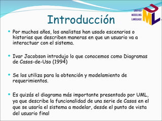 El documento describe los diagramas de casos de uso, incluyendo sus elementos principales como actores, casos de uso y las relaciones entre ellos. Explica que los diagramas de casos de uso modelan la funcionalidad de un sistema desde la perspectiva de los usuarios finales a través de la interacción entre actores y casos de uso.