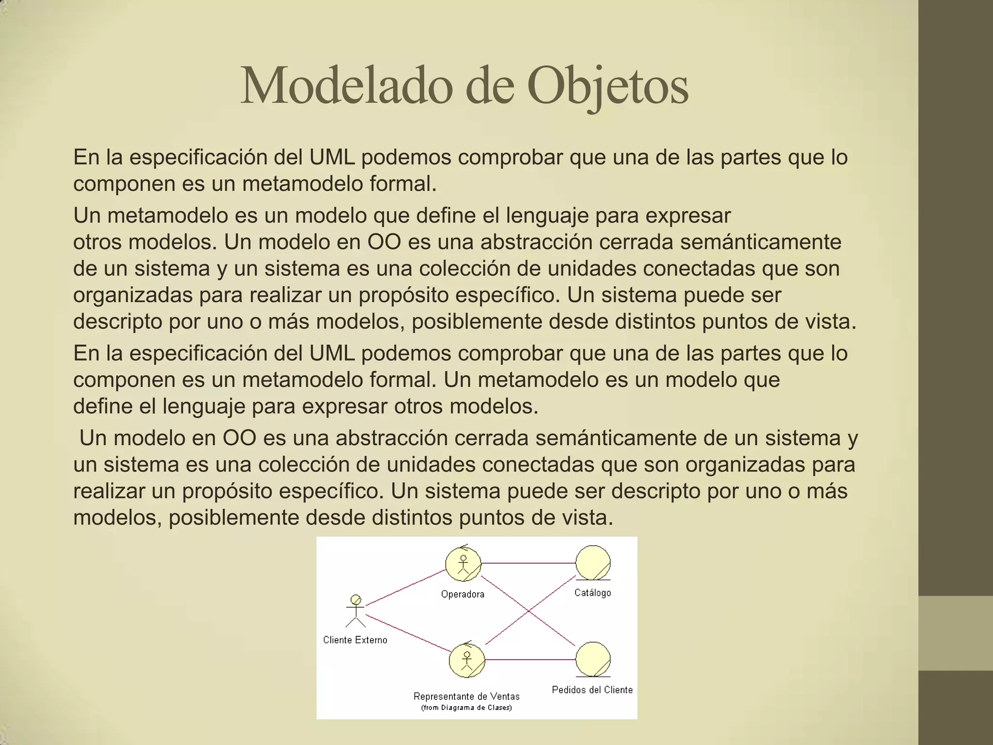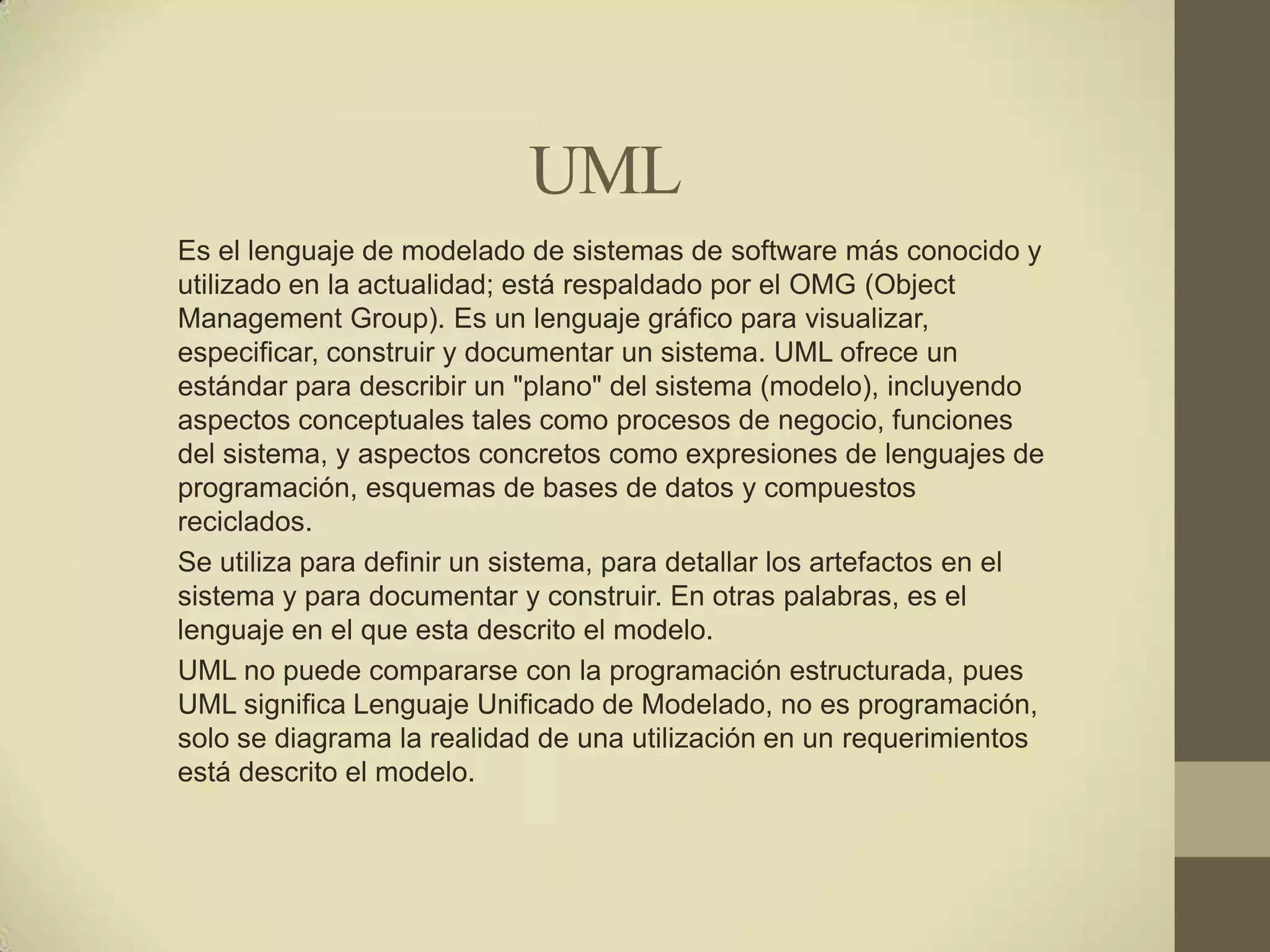 UML es el lenguaje de modelado de sistemas de software más conocido y utilizado actualmente. Permite visualizar, especificar, construir y documentar un sistema mediante diagramas que ofrecen diferentes puntos de vista del mismo. UML no define un proceso de desarrollo sino que las organizaciones pueden utilizarlo con sus propios procesos mediante diagramas como los de clases, casos de uso, secuencias e implementación.