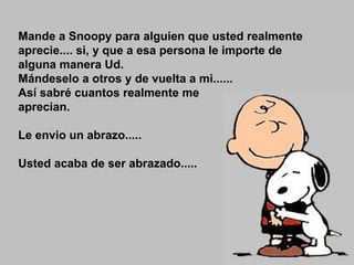 El documento habla sobre la importancia y el poder de un abrazo. Un abrazo puede transmitir calor y alegría, cambiar tristezas a alegrías, y mostrar afecto entre amigos de una manera más significativa que las palabras. Un abrazo es una forma fácil de hacer sentir bien a alguien sin necesidad de equipamiento o baterías; solo se necesitan abrir los brazos y el corazón.