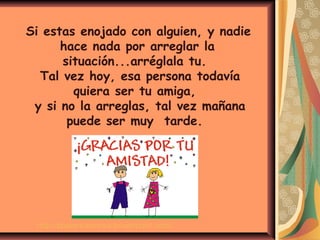 El documento enfatiza la importancia de expresar sentimientos como amor y aprecio hacia otras personas mientras aún se tiene la oportunidad, ya que la vida es frágil e impredecible y "mañana puede ser muy tarde". Recomienda arreglar disputas, dar besos y abrazos, decir "te amo" y demostrar afecto hacia amigos y familiares hoy en día sin esperar, pues uno nunca sabe lo que puede pasar en el futuro.