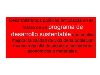 El documento propone políticas para el desarrollo sustentable y la mejora de la calidad de vida, enfatizando la importancia del acceso al agua y servicios cloacales. Aboga por la conservación de la biodiversidad, el tratamiento adecuado de residuos y el uso de energías renovables, al tiempo que se busca fomentar la educación ambiental. Se denuncia la falta de cumplimiento de leyes relacionadas con el medio ambiente y se subraya la necesidad de un manejo inteligente de los recursos naturales para evitar consecuencias graves como enfermedades y desertificación.
