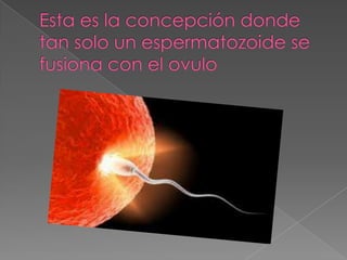 El documento resume el proceso de la fecundación desde la producción de espermatozoides hasta la concepción. Brevemente, explica que los espermatozoides miden 2 milésimas de milímetro, son producidos mitad niños y mitad niñas, y transportan el ADN. Solo unos 3000 espermatozoides son aptos para la concepción y deben sobrevivir en las trompas de Falopio durante horas, donde se alimentan y preparan para encontrar el óvulo. El óvulo solo vive 24 horas y la fecundación ocurre cuando dos espermatozoides
