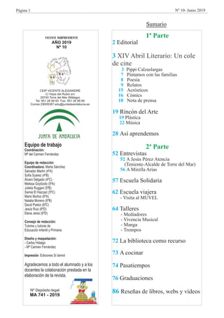 El documento es una revista del CEIP Vicente Aleixandre que destaca la colaboración entre alumnos, docentes y la comunidad en la creación de contenido para la publicación. Incluye entrevistas, relatos y diversas secciones relacionadas con la educación y el arte, además de abordar la importancia del compromiso político con la cultura y el medio ambiente en Torre del Mar. Finalmente, resalta proyectos culturales y educativos que buscan mejorar la calidad de vida y la sostenibilidad en el municipio.
