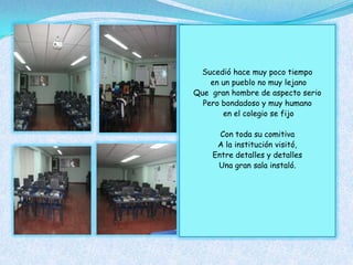 Este poema narra cómo una fundación ayudó a mejorar la infraestructura y programas de un colegio en un pueblo cercano. La fundación instaló una sala multimedia, pintó todo el colegio, e instaló un video beam. También conectó al colegio al mundo de las TIC a través de varios programas y capacitaciones docentes. Además, la fundación priorizó el medio ambiente en el colegio mediante la implementación de un programa ambiental y jornadas de reciclaje.