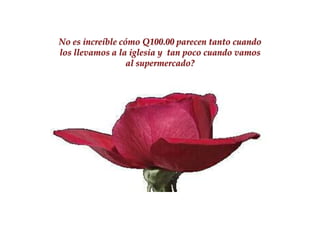 Este documento contiene una serie de reflexiones que contrastan la facilidad con que las personas se involucran en actividades seculares en comparación con las religiosas. Señala cómo las personas encuentran tiempo y energía para cosas como ir de compras, ver deportes o leer ficción, pero se sienten cansadas o poco comprometidas con actividades religiosas como la oración, leer la Biblia o asistir a la iglesia. Finalmente, desafía al lector a reenviar el mensaje si realmente ama a Dios.