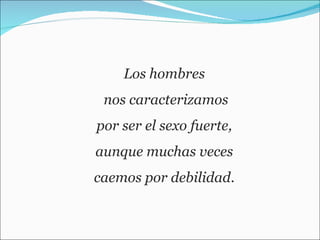 El documento habla sobre lo que significa ser un gran hombre. Según el texto, un gran hombre es aquel que es transparente, abre su corazón sin rechazar la realidad, admira a la mujer por su interior en lugar de lo superficial, y ama y apoya incondicionalmente a su pareja sin pedir nada a cambio. El documento cuenta la historia de la hermana del autor, quien encontró a un gran hombre que la hace feliz y nunca la ha hecho llorar.