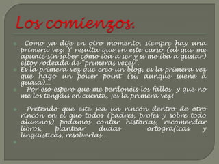 El documento habla sobre cómo el autor se encuentra en una situación nueva al apuntarse a un curso sin saber de qué trataría. Explica que es la primera vez que crea un blog y hace una presentación, por lo que pide disculpas por posibles errores. El objetivo del blog es que alumnos, profesores y padres puedan compartir historias, recomendar libros y debatir sobre literatura y lenguaje con la ayuda de expertos.
