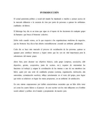 Este documento habla sobre el liderazgo y define algunos estilos de liderazgo como el autócrata, participativo y de rienda suelta. También menciona a cuatro líderes influyentes: Adolf Hitler, Mahatma Gandhi, Martin Luther King Jr. y Nelson Mandela. Concluye que el líder moderno debe ser estratégico, organizado y proactivo para dirigir con eficacia las organizaciones en el nuevo milenio.