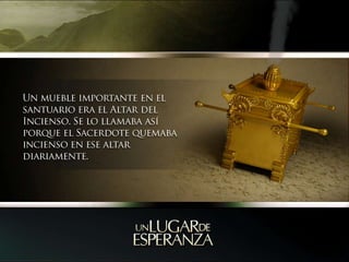 El documento describe el Altar del Incienso en el santuario bíblico, donde el sacerdote quemaba incienso y ofrecía sacrificios por los pecados. Esto prefiguraba la obra de Cristo como sumo sacerdote en el santuario celestial, donde ofrece su sangre por la humanidad. El amor de Dios se demuestra en el sacrificio de Cristo en la cruz para liberarnos del pecado y darnos vida eterna.