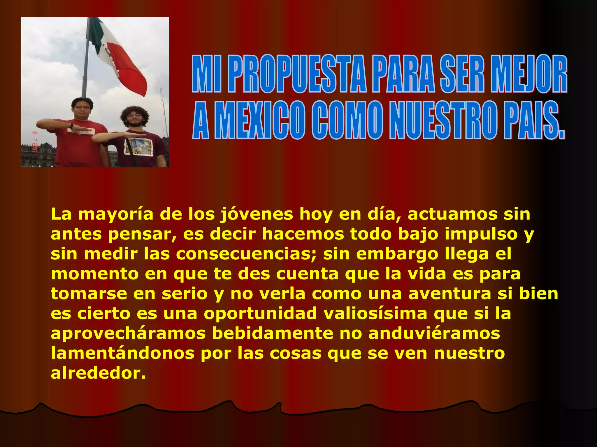 Este documento propone formas para mejorar México como país. Sugiere que los jóvenes piensen antes de actuar y aprovechen su vida de manera significativa. También argumenta que los mexicanos deben preocuparse más por su país y respetarlo evitando la contaminación. Finalmente, propone crear más puestos de trabajo para que los graduados universitarios puedan ejercer sus carreras y mejorar la vida en México trabajando de manera honrada y unida.