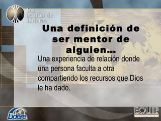 Este documento describe los conceptos de ser mentor y facultar a otros, así como los pasos y dones involucrados en el proceso de entrenar líderes. Explica que un mentor comparte sus recursos para empoderar a otra persona a través de una relación, y que facultar significa dar poder a otros para que puedan servir de manera efectiva.