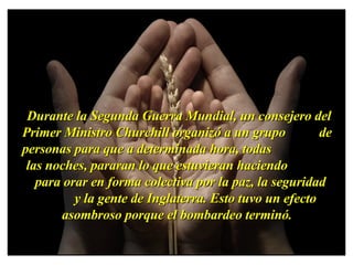 El documento propone que los venezolanos dediquen un minuto cada noche a las 8 pm a orar en forma colectiva por la paz del mundo, de Venezuela y los países vecinos, siguiendo el ejemplo de un grupo en el Reino Unido durante la Segunda Guerra Mundial cuyas oraciones nocturnas tuvieron un efecto asombroso al terminar los bombardeos. La oración se presenta como el capital más poderoso.