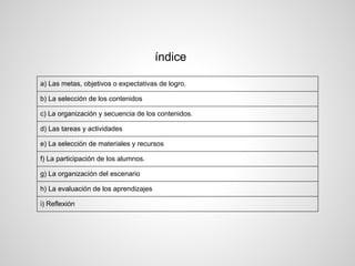 El documento describe 9 variables clave para la planificación de la enseñanza: 1) metas y objetivos, 2) selección de contenidos, 3) organización de contenidos, 4) tareas y actividades, 5) selección de materiales y recursos, 6) participación de los estudiantes, 7) organización del escenario, 8) evaluación de aprendizaje, y 9) reflexión. Explica brevemente cada variable y enfatiza la importancia de considerar estas variables para mantener el control y enfoque durante la clase.