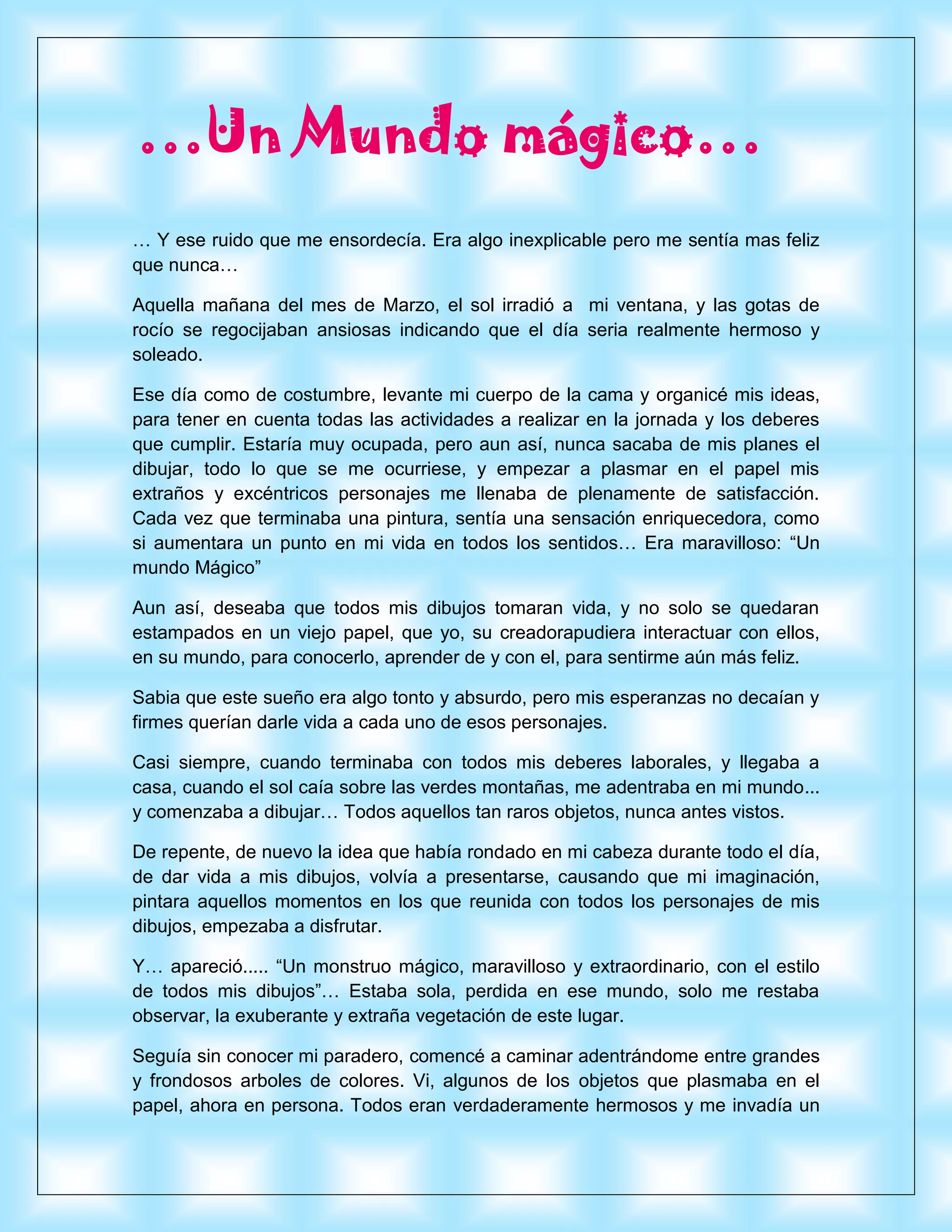 La autora describe haber ilustrado varios personajes extraños en sus dibujos. Un día, al adentrarse en un bosque mientras dibujaba, descubrió que sus creaciones habían cobrado vida mágicamente. Pudo interactuar y conocer a cada uno de sus personajes, incluyendo a Yato, su primer dibujo y fuente de inspiración. Disfrutó explorando su mundo mágico junto a los personajes, aunque eventualmente tuvo que regresar a la realidad.