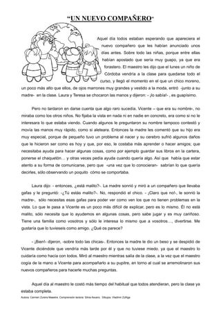 Las niñas de la clase esperaban ansiosas la llegada de un nuevo compañero, creyendo que sería guapo. Vicente, de Córdoba, resultó ser más alto y de ojos marrones, pero tenía dificultades de aprendizaje debido a problemas al nacer. Su madre explicó que necesitaba ayuda para algunas tareas pero que podía jugar y era cariñoso, pidiendo a los niños que lo trataran como amigo.