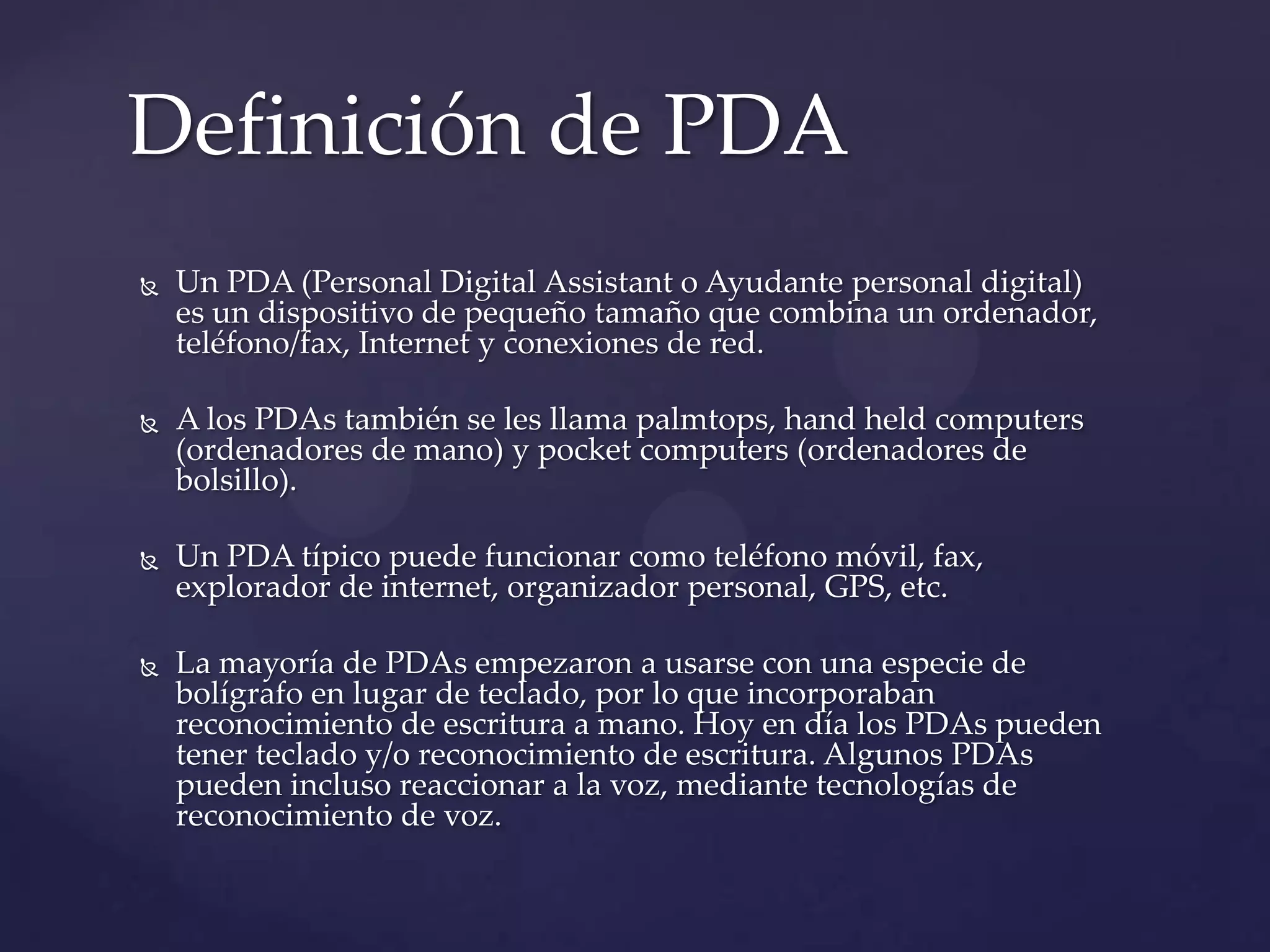 Un PDA (dispositivo digital asistente personal) es un dispositivo electrónico pequeño que combina las funciones de un ordenador, teléfono, fax, y acceso a Internet. Los primeros PDA carecían de teclado y usaban pantallas táctiles y reconocimiento de escritura. Aunque el Apple Newton de 1992 fue el primero en usar el término "PDA", fue la compañía Palm en 1995 la que impulsó su popularidad. Actualmente, los teléfonos inteligentes han reemplazado gran parte de las funciones de los PDA originales