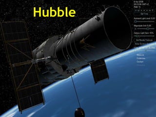 El documento proporciona información sobre el Telescopio Espacial Hubble. El Hubble es un telescopio ubicado en el espacio que orbita la Tierra. Ha tomado imágenes detalladas de galaxias, nebulosas y otros objetos celestes. El documento también incluye fotografías notables tomadas por el Hubble de objetos como la Galaxia del Sombrero y varias nebulosas, así como imágenes de planetas del sistema solar y otros temas astronómicos.