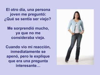 El documento habla sobre las ventajas de envejecer y la libertad que trae hacerse viejo. La autora dice que a pesar de las arrugas y cambios físicos, valora su familia, amigos y vida. Ahora se acepta a sí misma y disfruta pequeñas cosas como leer o bailar música de los 50-60. Aunque a veces es olvidadiza, valora las cosas importantes. El sufrimiento le ha dado fuerza y ya no le importa lo que otros piensen. Le gusta la persona en la que se ha convertido y anima a otros a