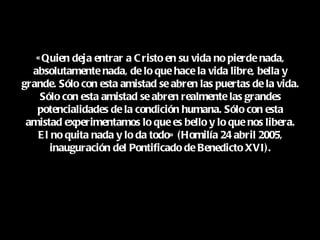 El documento expone la importancia de la amistad con Cristo y cómo esta relación transforma la vida humana, promoviendo la verdad y el amor sobre el egoísmo. Se resalta que el cristianismo aporta alegría a través del sacrificio personal y la comunión con el sufrimiento de Cristo, siendo esencial la participación en la Eucaristía como fuente de fuerza. Además, se invita a aprender de María a ser una comunidad que ora y se dirige a Dios en unidad para superar dificultades y proclamar el mensaje de salvación.