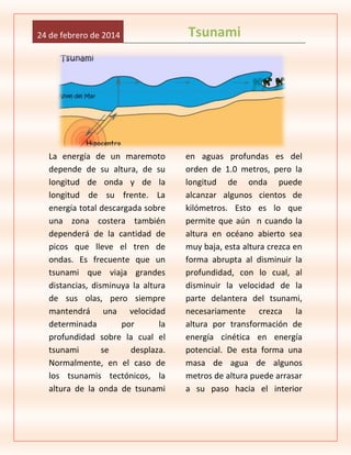 Un tsunami o maremoto es una serie de olas de gran energía causadas principalmente por terremotos o erupciones volcánicas. Se producen cuando un sismo o erupción mueve verticalmente una gran masa de agua, generando olas que pueden viajar grandes distancias a alta velocidad e inundar las costas, causando graves daños. El Océano Pacífico es la zona más afectada debido a su alta actividad sísmica.