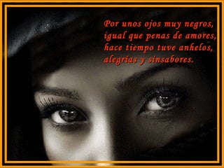 El documento habla sobre un viejo amor del cantante caracterizado por ojos negros que le causaron alegrías y penas. Aunque el amor se alejó con el tiempo, el cantante no olvida la promesa de amor de esos ojos que alguna vez lloraron por él. Años después vuelve a ver esos ojos, pero ya sin amor, lo que le hace preguntarse si el tiempo borró las promesas del pasado. El cantante concluye que un viejo amor nunca se olvida ni se deja a pesar de alejarse del alma