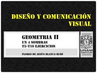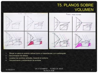 Este documento presenta 9 lecciones sobre sombras en volúmenes. Cada lección describe los pasos para dibujar un objeto tridimensional y trazar sus sombras, incluyendo la delimitación y oscurecimiento de las sombras. Los objetos incluyen prismas, volúmenes con adiciones y planos interiores. El documento proporciona instrucciones detalladas para que los estudiantes aprendan a representar visualmente cómo la luz crea sombras tridimensionales.