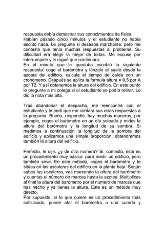 Este documento presenta la historia de una anécdota contada por Sir Ernest Rutherford sobre un estudiante llamado Niels Bohr. El estudiante había respondido correctamente a una pregunta de un examen de física usando métodos ingeniosos en lugar de los convencionales. Más tarde, cuando se le dio la oportunidad de explicar su respuesta con conocimientos de física, proporcionó varias soluciones adicionales creativas al problema. La lección principal de la historia es que al estudiante se le enseñó a pensar de manera
