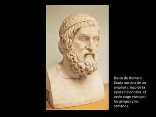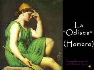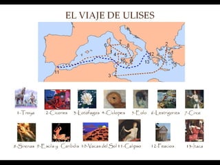 Este documento presenta un resumen de la Odisea de Homero a través de una serie de imágenes y textos. Narra el viaje de regreso de Odiseo a Ítaca después de la guerra de Troya, donde enfrenta numerosas dificultades como tormentas, monstruos y hechiceras. Finalmente llega a Ítaca donde se reencuentra con su esposa Penélope y su hijo Telémaco, y juntos se vengar de los pretendientes que querían usurpar su reino durante su ausencia.