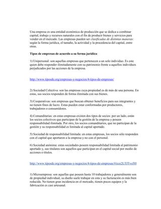 El documento clasifica y describe los diferentes tipos de empresas. Las principales formas jurídicas de empresas son la sociedad anónima, sociedad colectiva, sociedad en comandita y sociedad de responsabilidad limitada. Las empresas también se clasifican según su tamaño (micro, pequeña, mediana y grande), sector económico (primario, secundario y terciario) y origen del capital (pública, privada y mixta). Cada tipo de empresa se distingue por aspectos como el número de socios/accionistas, formación del capital social, responsabil