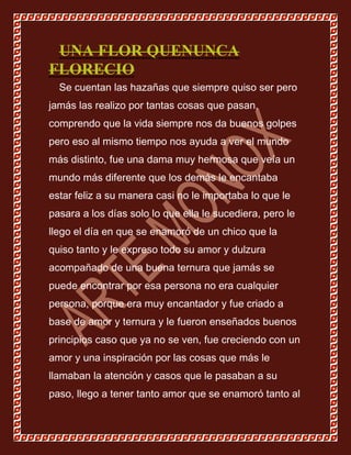 Este documento narra la historia de un joven pintor y poeta que se enamoró de una mujer misteriosa. A pesar de expresarle su amor a través de su arte, la mujer nunca reveló sus verdaderos sentimientos por orgullo. El joven lamenta que su amor por ella nunca pudo florecer y que tal vez nunca podrán estar juntos. El documento es una dedicatoria del autor para esa mujer que le robó el corazón.