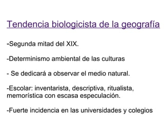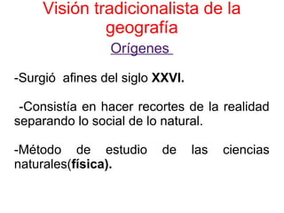 Este documento describe la evolución de la visión de la geografía a través del tiempo. Comenzó como una ciencia descriptiva separada de lo social y natural en el siglo XIX, luego se enfocó en el determinismo ambiental de las culturas. En la segunda mitad del siglo XX se transformó en el estudio de los aspectos territoriales de los desarrollos sociales. Hoy en día, la geografía selecciona contenidos relevantes social y científicamente para que los estudiantes entiendan el mundo, con una perspectiva histórica de los procesos de