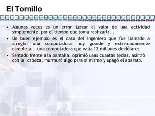 El ingeniero arregló una computadora de 12 millones de dólares apretando un tornillo minúsculo. Cuando el presidente de la compañía se negó a pagar los 1,000 dólares que cobró el ingeniero por su trabajo, este le envió una factura detallada donde cobró 1 dólar por apretar el tornillo y 999 dólares por saber qué tornillo apretar.