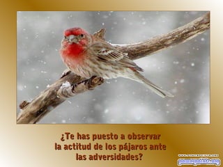 El documento habla sobre la perseverancia de los pájaros ante las adversidades. Describe cómo los pájaros pasan días construyendo sus nidos con materiales recogidos de lejos, pero a menudo estos son destruidos por el clima o animales. A pesar de esto, los pájaros no se rinden y vuelven a empezar una y otra vez hasta que logran criar a sus polluelos. El documento anima a las personas a no rendirse ante los golpes de la vida, sino a seguir luchando como los pájaros lo hacen.