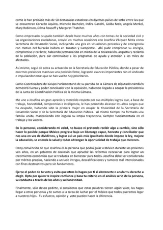 El documento argumenta que una mujer, Josefina Vázquez Mota, tiene la capacidad para ser presidenta de México. El autor detalla la trayectoria y logros de Vázquez Mota en cargos públicos previos y su trabajo, honestidad y compromiso. El autor expresa su apoyo a Vázquez Mota para las próximas elecciones presidenciales y cree que ella puede guiar a México a ser más igualitario y próspero.