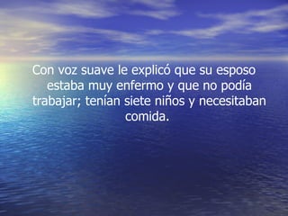 Una mujer pobre le pidió crédito al dueño de una tienda para comprar comida para su familia, pero él se negó. Un cliente que escuchó la conversación ofreció pagar por las compras de la mujer. En lugar de una lista de compra, la mujer entregó una oración pidiendo ayuda a Dios. El peso de la oración sorprendió a los hombres, quienes le dieron abundante comida a la familia.