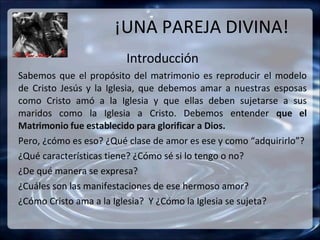 El documento explora el modelo cristiano del amor en el matrimonio, enfatizando cómo los esposos deben amar a sus esposas como Cristo ama a la iglesia, promoviendo la santidad y la unidad. Se destacan características del amor ágape, que es desinteresado y sacrificado, y se compara con otros tipos de amor como el eros y philia. Además, se menciona que el amor verdadero se expresa a través de actos de cuidado, honor y perdón, siendo la base fundamental en la relación matrimonial.