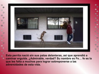 Este documento habla sobre una perrita llamada Fe que nació sin sus patas delanteras pero aprendió a caminar erguida, visitando hospitales y escuelas para motivar a otros a superar sus adversidades. El documento también menciona ejemplos humanos que han superado sus limitaciones y anima a los lectores a no rendirse ante sus propias limitaciones, teniendo fe en que pueden lograr sus sueños a pesar de cualquier debilidad o circunstancia.