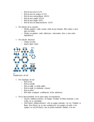 Un documento describe los componentes básicos de las redes de computadoras, incluyendo ordenadores, tarjetas de red, tipos de sitios de trabajo como servidores, y protocolos de red. Explica que una red conecta al menos dos ordenadores para compartir información y recursos.