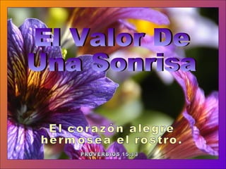 El documento destaca la importancia de la sonrisa como un signo de alegría y conexión humana, citando diversas frases que enfatizan su poder para mejorar tanto el estado de ánimo personal como el de los demás. Se menciona que una sonrisa puede ser un gran recurso emocional y social, capaz de comunicarse en todos los idiomas. Además, se resalta que sonreír contribuye a crear un ambiente de amor y cordialidad entre las personas.