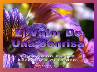 El documento contiene varias citas sobre el valor y el poder de una sonrisa. Las citas describen cómo una sonrisa puede iluminar la cara y calentar el corazón, comunicar alegría a otros, y ser un lenguaje universal de amor que no cuesta nada pero vale mucho.