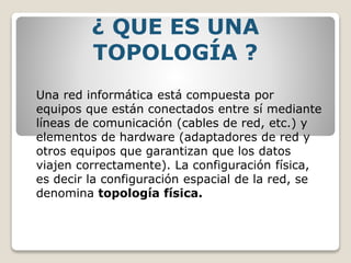 Este documento describe los diferentes tipos de topologías de red, incluyendo topología de bus, topología de estrella, topología en anillo, topología de árbol y topología de malla. Explica que una topología describe la configuración física de una red y cómo los equipos están conectados entre sí a través de cables y otros elementos de hardware.
