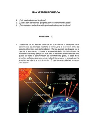 El calentamiento global se produce cuando los gases de efecto invernadero atrapan más calor en la atmósfera, causando un aumento de las temperaturas globales. Los principales factores que lo producen son la contaminación y la destrucción de la capa de ozono. Algunas formas de disminuir su impacto son usar bombillas y electrodomésticos más eficientes, ajustar el termostato, secar la ropa al aire, comprar productos reciclados y usar menos el automóvil.