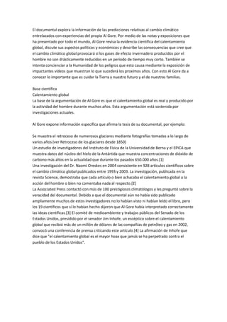 El documento resume el documental "Una verdad incómoda" de Al Gore, el cual expone la evidencia científica del calentamiento global causado por el hombre y las acciones que se deben tomar para prevenir sus efectos. Al Gore recibió el Premio Nobel de la Paz en 2007 por su labor de comunicar este tema al público a través de conferencias y este documental, el cual fue un éxito y ayudó a concientizar a más personas sobre la urgencia de la crisis climática.