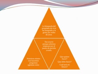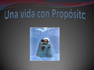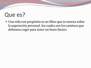 Este documento habla sobre tener una vida con propósito y cómo encontrar el significado de la vida. Explica que una vida con propósito enseña sobre la superación personal y los caminos para tener un buen futuro. Además, señala que el propósito de la vida va más allá de nosotros mismos y que debemos enfocarnos en servir a Dios, ya que fue para Él que fuimos creados y solo así encontraremos sentido en nuestras vidas.