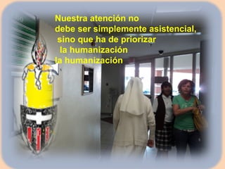El documento habla sobre la importancia de la Iglesia en cuidar a los enfermos y ancianos a través de la historia, enfatizando la humanización y el buen trato. También menciona que Jesús sanaba a todos y predicaba la Buena Nueva, por lo que la caridad, alegría y cercanía son valores importantes para continuar su legado de ayudar a los necesitados con solidaridad, escucha y paciencia.