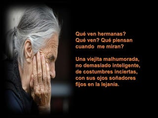 El poema describe la experiencia de envejecer desde la perspectiva de una mujer, pasando por las diferentes etapas de su vida como niña, joven, esposa, madre y finalmente anciana. A pesar de los cambios físicos del envejecimiento, su espíritu joven permanece intacto. Ella le pide a los demás que vean más allá de las apariencias y comprendan su verdadera identidad. Los pasajes bíblicos enfatizan la importancia de cuidar a las viudas y los huérfanos.