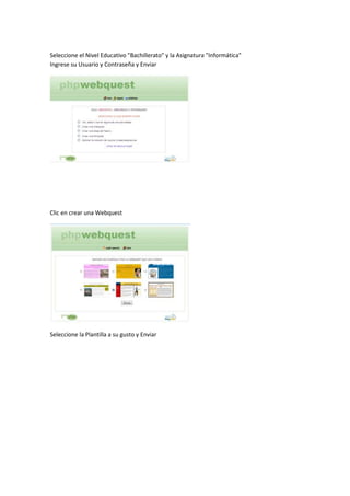 La webquest es una herramienta educativa que fomenta habilidades cognitivas superiores y el trabajo en cooperación, utilizando recursos de Internet. El documento detalla el procedimiento para crear una webquest en el nivel de bachillerato en informática, incluyendo las actividades a desarrollar y su evaluación. Al finalizar, se genera un enlace para compartir el webquest en un blog.