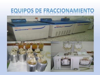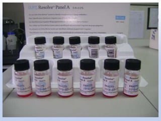 El documento describe los componentes sanguíneos como suero y plasma, y explica la reacción antígeno-anticuerpo. También enumera las pruebas de tamizaje realizadas en el banco de sangre como VIH, hepatitis B y C, y Chagas. Finalmente, resume los equipos y técnicas de laboratorio utilizados para realizar pruebas de tipificación sanguínea y cruzada.