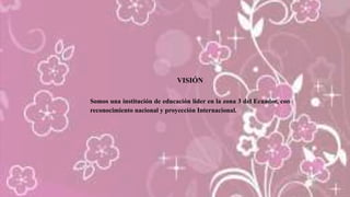 La misión es crear, desarrollar, transferir y difundir conocimiento y cultura a través de la formación académica, investigación y vinculación con la comunidad bajo principios de pertinencia, integralidad, interculturalidad, equidad y preservación ambiental para construir una mejor sociedad. La visión es ser una institución líder de educación en la zona 3 de Ecuador, con reconocimiento nacional e internacional.